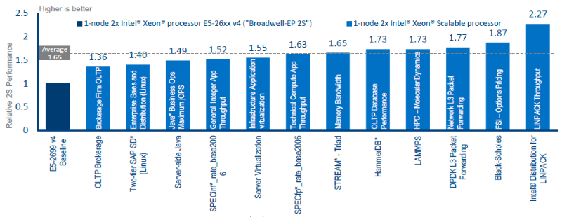 Intel showed tests with two dozen companies, each with different workloads. Results ranged from Skylake beating Broadwell chips by 1.4x for Ansys manufacturing software to 2.2x for apps using Skylake along with Intel’s proprietary Optane solid-state memory drives.