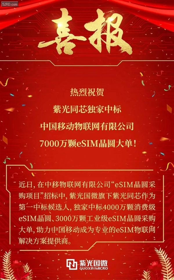 10月27日晚间,紫光集团宣布,近日,在中国移动物联网有限公司的“eSIM晶圆采购项目”招标中,紫光国微旗下紫光同芯作为第一中标候选人,独家中标7000万颗eSIM晶圆的采购大单。